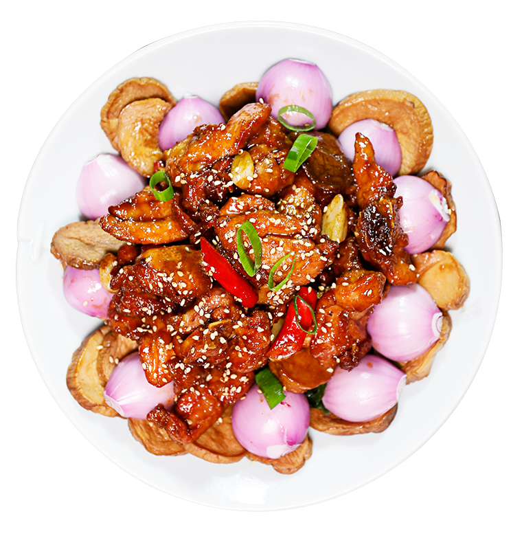 三黃雞、油炸杏鮑菇、大蒜頭、姜片、洋蔥、九層塔、黑芝麻有、米酒、醬油