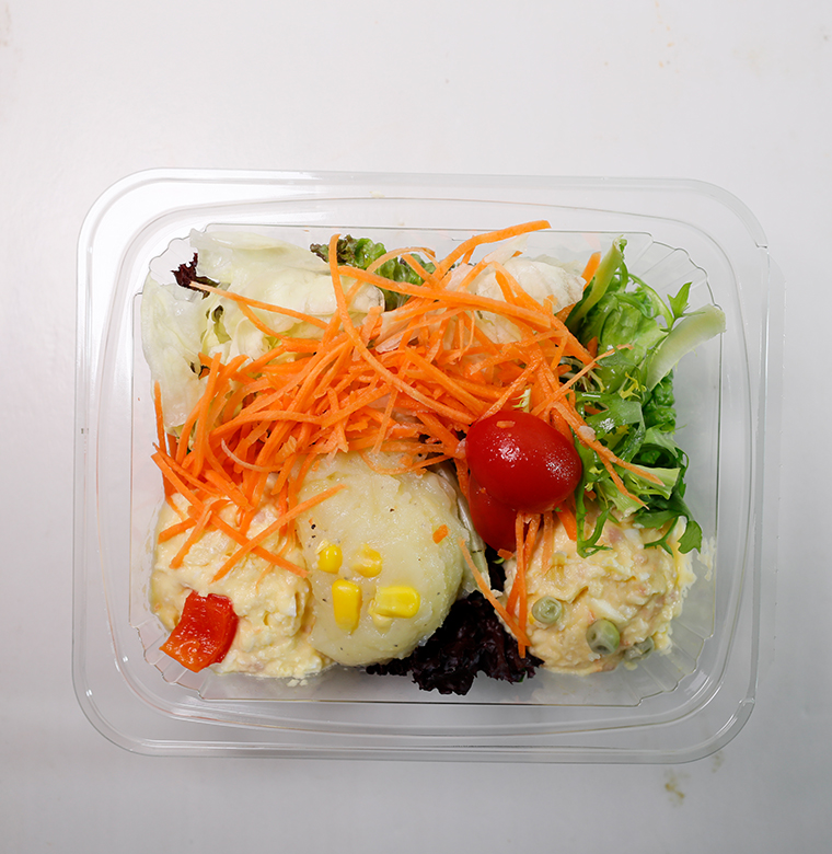 土豆、雞蛋、胡蘿卜、蛋黃醬、圣女果、西生菜、生菜、苦苣、玉米粒、紫葉生菜、三文治腸